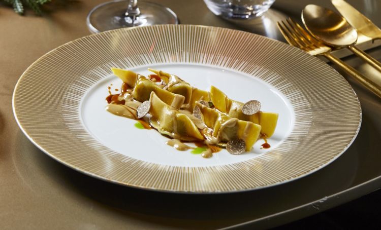 Casoncello ai tre arrosti, salsa foie gras, tartufo nero e olio alla salvia: «È legato alla tradizione lombarda, ma l'abbiamo reinterpretato», spiega