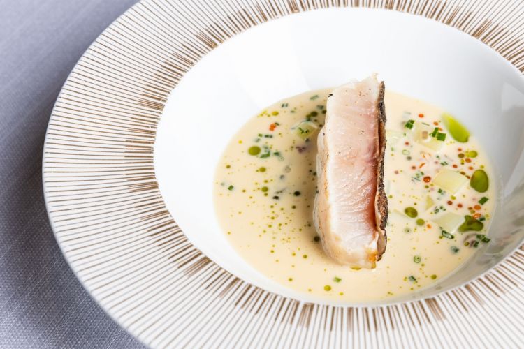 «Il salmerino viene fatto asciugare in frigorifero per quattro giorni, per rendere la pelle più croccante e insaporire il pesce, che essendo di lago non ha grande sapidità. Poi viene cotto alla brace, la salsa è fatta con un brodo di teste di pesce macerato, e aggiungiamo le patate. Da noi il piatto classico di pesce era trota o salmerino alle erbe, quindi abbiamo messo bieta e aglio orsino. Il beurre blanc dà quella nota un po' classica e insieme moderna».