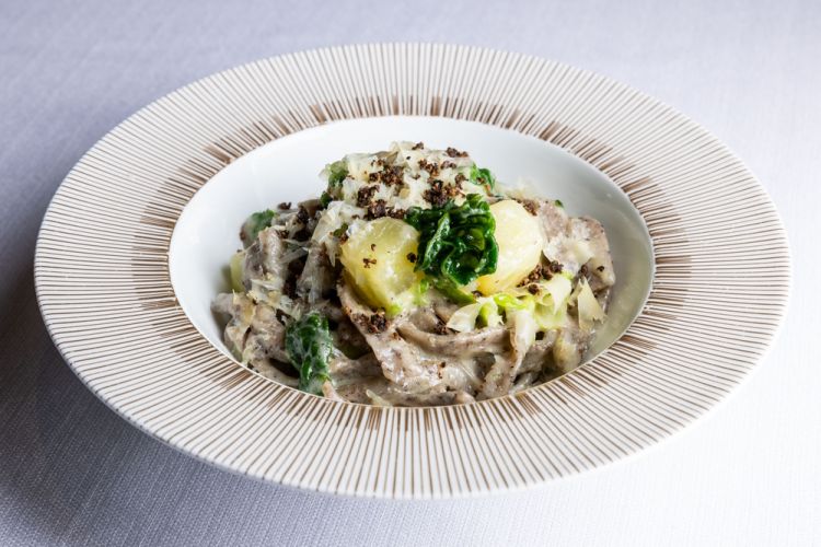 «Farina di grano saraceno valtellinese, macinata a pietra, e grano tenero. Solo acqua, niente sale né albume. Poi patate e verze, o altre verdure in base alla stagione, e un formaggio semi-grasso, come il Latteria o il Casera. La peculiarità dei miei pizzoccheri è che cuocio verze, patate e pasta insieme nella stessa acqua, poi li scolo molto bene, li condisco col formaggio, lascio che si sciolga col calore, e di burro ne metto pochissimo, puntando su questa carnosità molto golosa, invece che cercare quella consistenza brodosa che hanno spesso. Quando li mangi così, li mangi tutti, non ti riempiono, non sono pesanti. Senti il grano saraceno, la patata cotta bene, la verza: sembrano quasi leggeri».