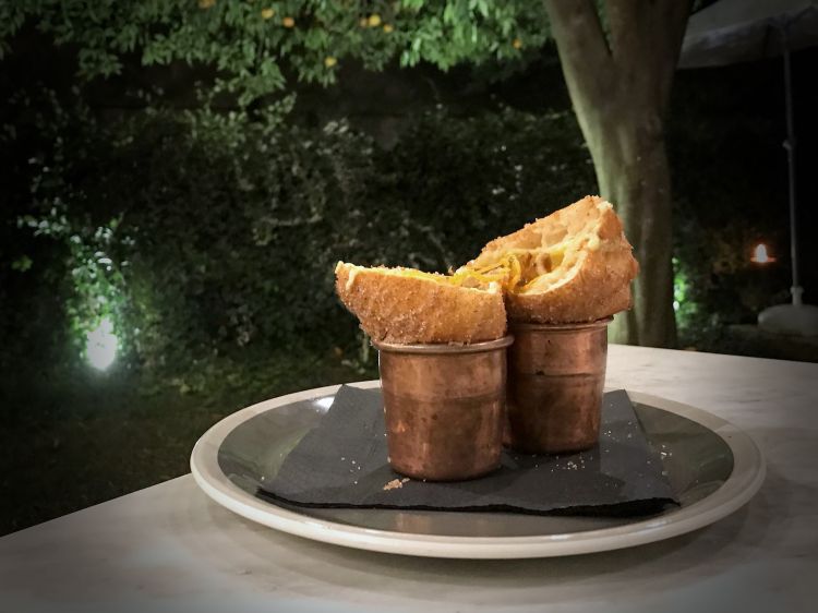 Finale dolce con la Pastiera fritta, ancora di Stefano Pepe, un omaggio al grande pasticcere campano Alfonso Pepe: un cono fritto con crema pasticcera, fiordilatte, zucchero, cannella, nocciola, canditi, zest all'arancia. Crea dipendenza