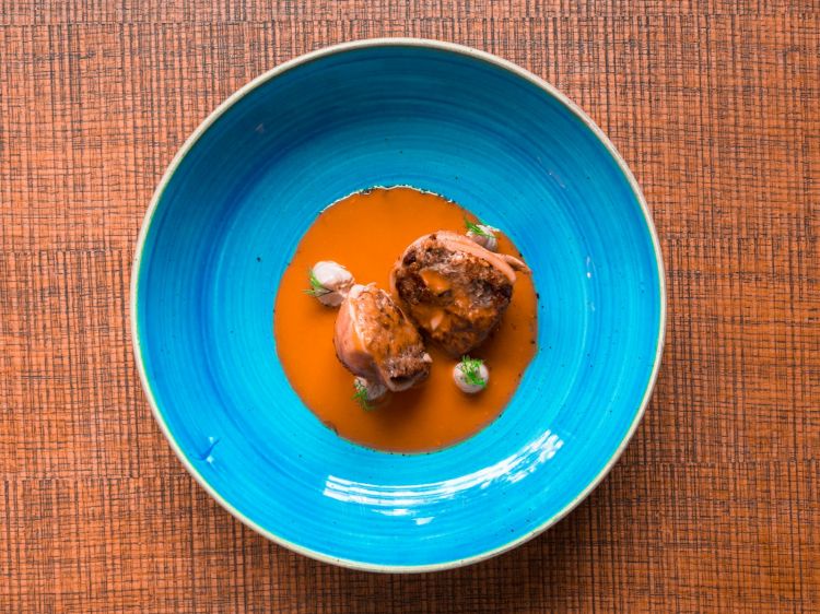 Finiamo la preparazione facendo tostare le teste farcite in una padella molto calda per pochissimi minuti. Assemblate il piatto ponendo le teste al centro con un po' di maionese e versatevi sopra su un po' di guazzetto di polpo.