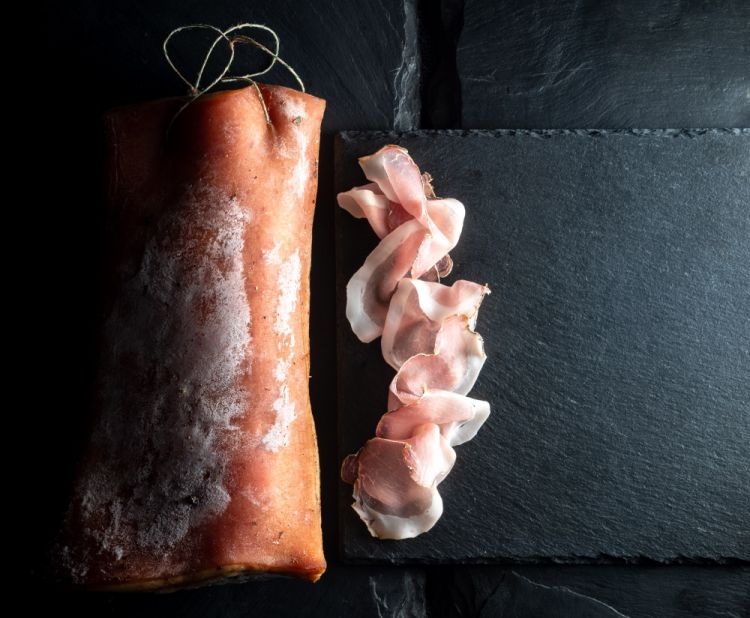 Alcuni prodotti di Ma! Officina gastronomica ottenuti dal suino nero delle Alpi: Pancetta