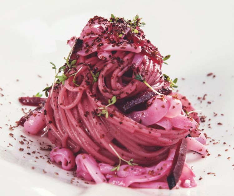Colombaccio rosa, salsa all’ibisco, radicchietto di Verona grigliato, senape e gelatina di aceto di miele di castagno