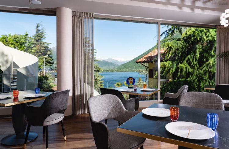 La sala del ristorante è elegante e molto luminosa grazie alle ampie finestre panoramiche che permettono di godere di un'affascinante vista sul parco e sul paesaggio lacustre del resort, mentre durante la bella stagione dalla spettacolare terrazza esterna, si gode davvero di una vista unica e suggestiva.