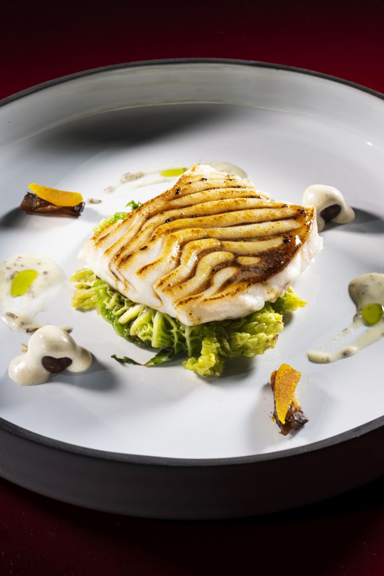 Ricette Immorali - Montalban: Rombo, purè al tartufo nero, datteri e bottarga di muggine. Questo piatto, oltre che essere il culmine del gusto nella parte salata del menu, rappresenta una sinergia con la Madonnina del Pescatore, dove viene servita la Costoletta di rombo; infatti, il pesce si “divide” tra Marzocca e Portonovo, contro ogni spreco. Umami puro
