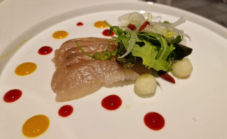 Sashimi di lampuga rinfrescato da salsa alle bacche di goji, la dolcezza della