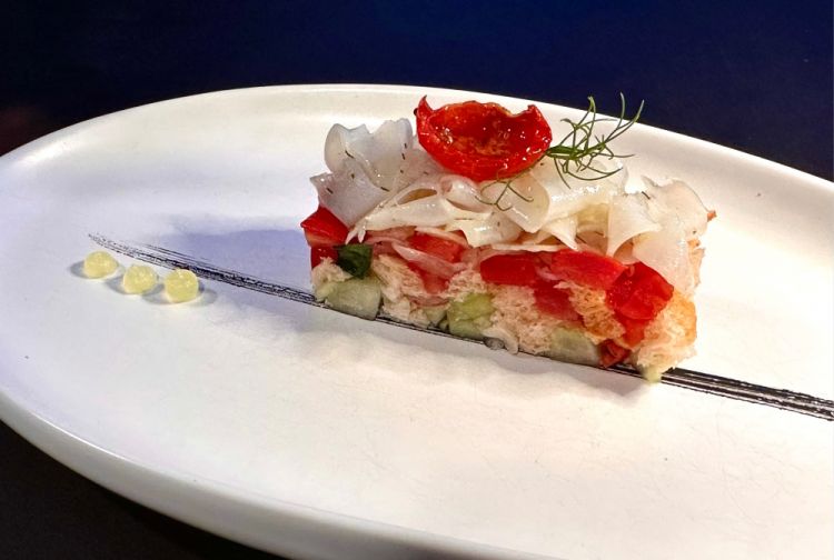 Panzanella toscana, delicata e divertente nei sapori e nella forma, con julienne di seppia e pomodoro confit.