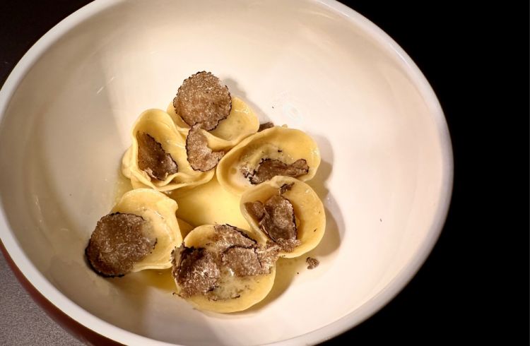 Tortelli ripieni di faraona, con tartufo e acqua di pecorino.
