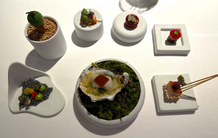 Il benvenuto: Pancia maialino avvolta da quinoa soffiata, con sanguinaccio in superficie; Ostrica, gel di salsa ponzu, lattuga di mare, granita di agrumi; Chips al nero di seppia, peperoncino dolce, maionese al basilico; Cono di riso, aneto ed erba cipollina; Polpo scottato, ravanello, paprika dolce; Meringa fatta con acqua di barbabietola, barbabietola fresca e fermentata; Mini sushi con alga esterna, riso, tartare di astice, avocado e rapa rossa. Vanno gustati in quest'ordine, per creare una sorta di montagne russe del gusto, alternando picchi forti a spazi più confortevoli
