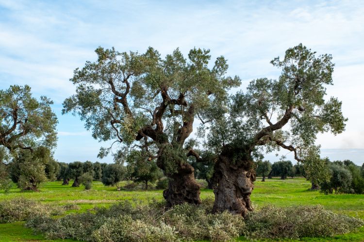 Gli ulivi dai tronchi contorti, nervosi, scultorei, sono icone del paesaggio e simbolo della cultura contadina. Distese di Coratina, Cima di Mola, Ogliarola di Bitonto e Garganica, Peranzana, Olivastra, rivestono pianure e colline. Oltre 350.000 ettari di ulivi, portati qui da Fenici e Greci, che hanno affondato le radici in terra di Puglia e scritto la millenaria storia del suo olio, oro verde di questa regione.