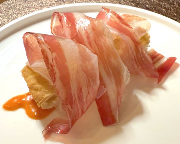Orecchie di maiale Cinturello in salsa orientale, whisky giapponese e arancia. Le orecchie di maiale sono gustose e vengono esaltate da un mix di spezie orientali. Il whisky si percepisce leggermente in sottofondo e dona profondità al piatto, mentre l’arancia apporta freschezza e dolcezza