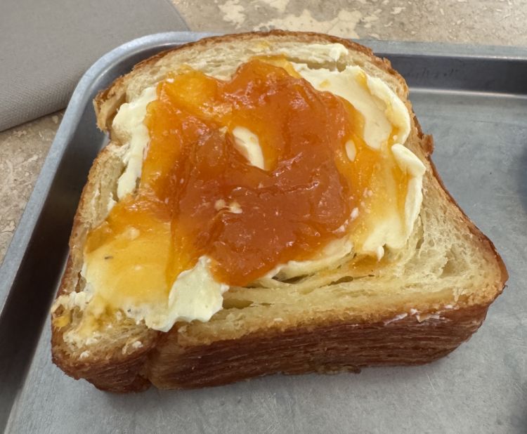 Sisu mi è piaciuta tantissimo. I lievitati sono sontuosi e divertenti, e le scelte sono ricadute sia sul dolce che sul salato. Pane da fetta tostata sfogliata accompagnata da burro e marmellata di albicocche,