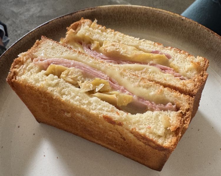 Pain suisse che già visivamente ti cattura, entrambe le proposte dei toast, uno con il cotto, Branzi e carciofini, l'altro con zucchine ripassate, Camembert e maionese. Spaziali e goduriosi.