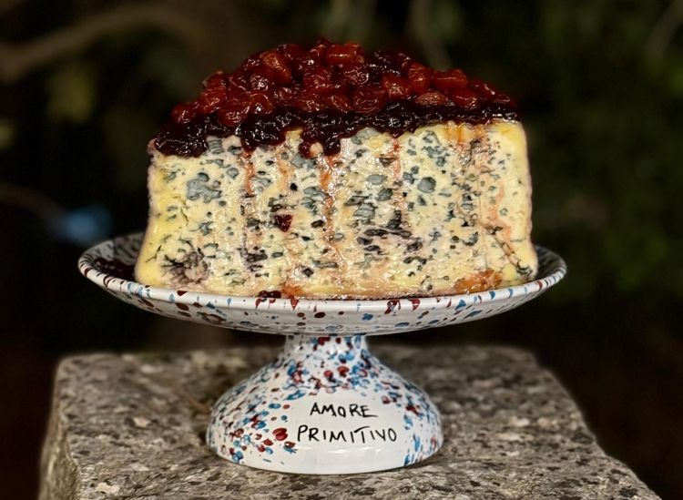 Amore primitivo, un signor formaggio che si presenta a tutti gli effetti come una torta. In sostanza parliamo di un Blu della Murgia affinato per 100 giorno nel vino Primitivo passito, arricchito con amarene. “Intense!”
