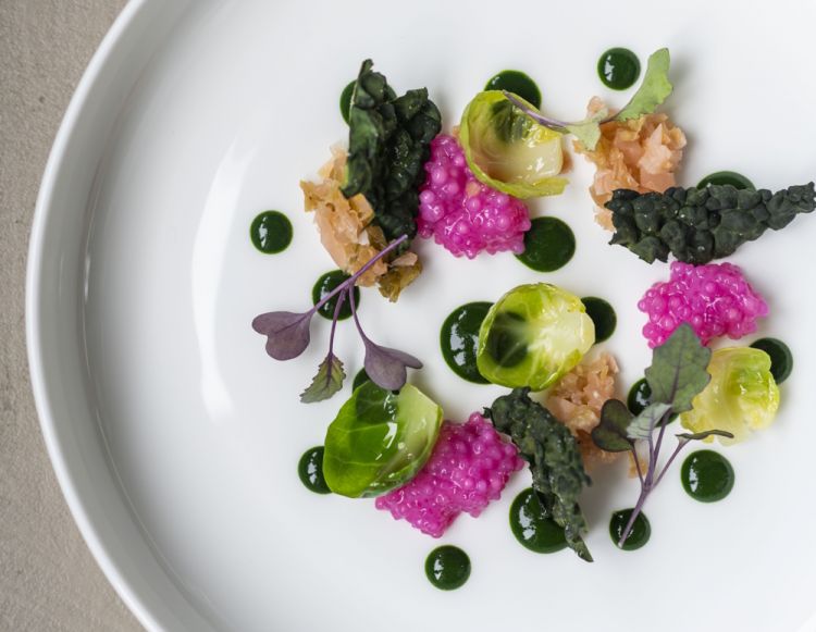 Sottospalla di fassona marinata al koji di riso e fieno aromatico, con consistenze di barbabietole e mela Kissabel, fondo bruno alla mela, classica e potente.