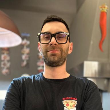 Black Wood, con pomodoro san marzano, fiordilatte, salame piccante, 'nduja di Spilinga, olive taggiasche, stracciatella, polvere di pomodoro semi-secco, olio evoLa pizza dolce
