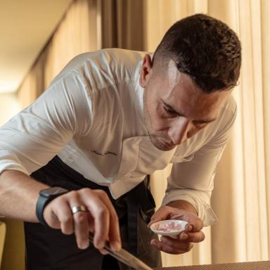 12 Fontane rappresenta il cuore fine dining di Villa Neri Resort & Spa, esclusivo rifugio di charme con 24 camere, centro benessere e piscina, alle pendici dell’Etna, inaugurato nel 2012 dagli imprenditori catanesi Salvo e Fabio Neri. Executive chef della struttura è Elia Russo, classe 1997, bravo a raccontare il territorio in modo autentico, esaltando gli ingredienti locali di qualità. Nei piatti proposti dal cuoco autoctono non si percepisce una ricerca di avanguardia fine a se stessa, ma un approccio maturo, in cui la consapevolezza delle proprie radici si unisce a una visione contemporanea.