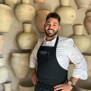 Carusu è la scommessa della famiglia Mangione: da una pizzeria a un ristorante gastronomico immerso nella Valle dei Templi, affacciato sul quartiere Ellenistico Romano. In cucina, Alen Mangione – classe 1998 e formatosi nelle cucine di Da Vittorio, sotto la guida dei Cerea – lavora con misura e sensibilità, costruendo una proposta che coniuga comfort e golosità con tecnica e pulizia.