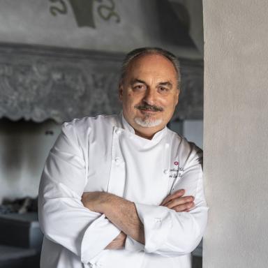 La meraviglia di un paesaggio senza età. Siamo a pochi chilometri da Firenze, Tavernelle, sulla strada che corre per Siena. Colline a perdita d'occhio: olivi e vigne per grandi rossi. Il Castello risalente al XII secolo, una tenuta di trecento ettari, rinnovato dagli interni da Paola Navona, è il luogo dove opera Giovanni Luca Di Pirro, cuoco schivo, lontano dai riflettori ma di grande professionalità e di notevoli risultati.