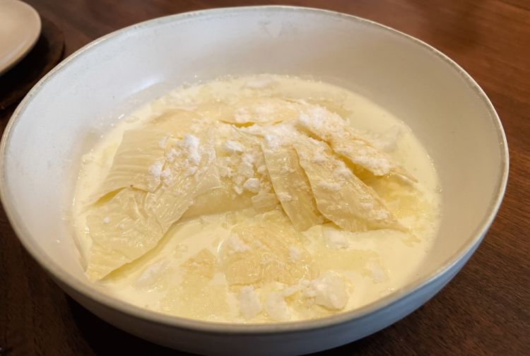 Latte è infatti un esercizio di declinazione di uno degli ingredienti fondamentali della cucina, proposto in sei diverse consistenze, sfumando dal cremoso al croccante, che riesce a riempire il palato di memorie d'infanzia mantenendo una leggerezza per nulla scontata.
