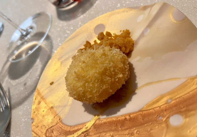 Uovo panato nel panko con granita di ricci e mais, servito su un piatto di silicone. La granita si perde un poco sotto la cremosità ingombrante dell’uovo